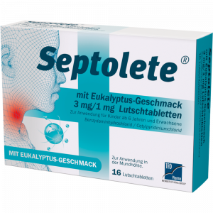 Wirkstoffe: Benzydaminhydrochlorid/Cetylpyridiniumchlorid. Anwendungsgebiete: Septolete mit Eukalyptus-Geschmack wird angewendet zur Behandlung von Halsschmerzen in Verbindung mit leichten Entzündungen im Mund- und Rachenraum (einschließlich Pharyngitis). Wenn Sie sich nach 3 Tagen nicht besser oder gar schlechter fühlen, wenden Sie sich an Ihren Arzt. Warnhinweise: Septolete mit Eukalyptus-Geschmack enthält Isomalt (E953).