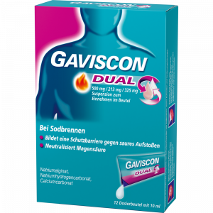 Wirkstoffe: Natriumalginat, Natriumhydrogencarbonat, Calciumcarbonat. Anwendungsgebiete: Behandlung der säurebedingten Symptome des gastroösophagealen Reflux wie Sodbrennen, saures Aufstoßen, Verdauungsstörungen (Dyspepsie) z.B. nach den Mahlzeiten oder während der Schwangerschaft. Warnhinweise: Enthält Natriumverbindungen, hoher Natriumgehalt, Menthol, Methyl-4-hydroxybenzoat (E 218), Propyl-4-hydroxybenzoat (E 216).